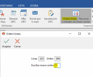 Por defecto, la secuencia de las líneas de "detalle" grabadas es de 5 en 5, por lo que si en el momento del Alta Ud. indica un nº de línea en un hueco existente, la posición de está será la indicada sin necesidad de gestionar por el proceso de este artículo de 'orden de líneas'.